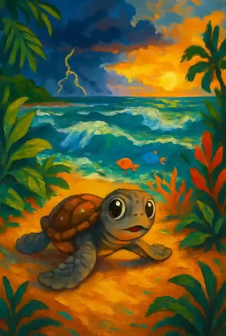 Uma filhote de tartaruga enfrenta os perigos do oceano para completar sua primeira grande viagem.