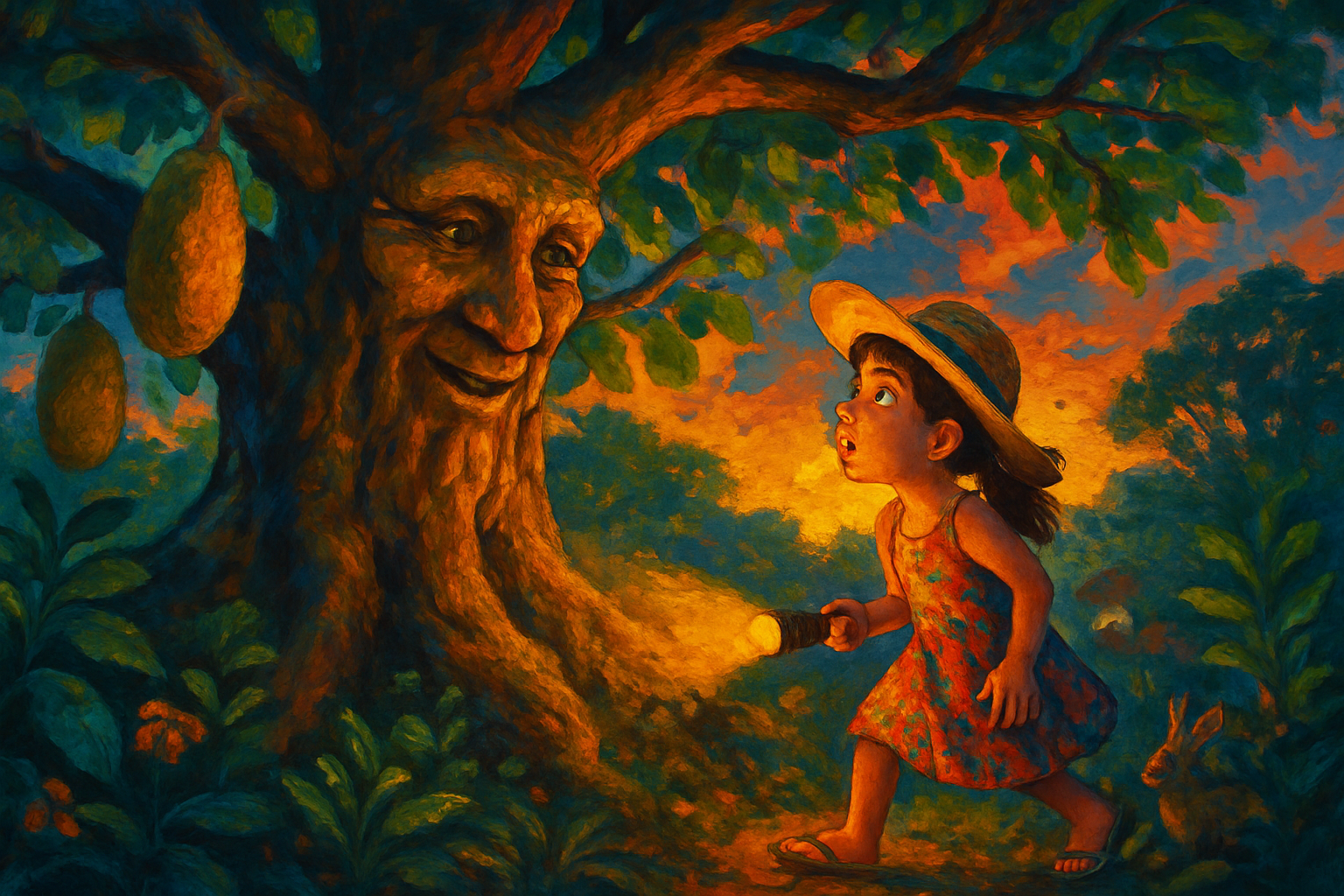 Lia foi pulando pelas pedras do caminho, desviando de uma poça aqui, outra ali, como se fosse uma brincadeira. No fundo do quintal, porém, havia um lugar que ela sempre olhava de longe com um misto de respeito e vontade de chegar perto: uma **jaqueira enorme**, velha como as histórias que a avó gostava de contar.