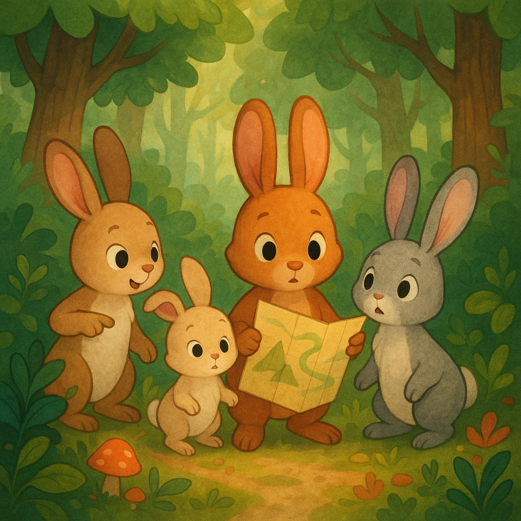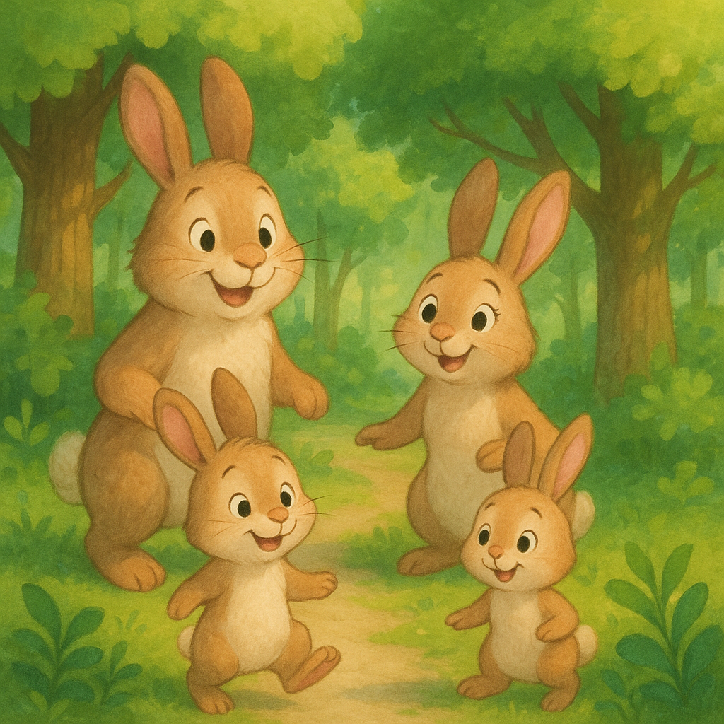 Em um belo dia de sol, a Família Coelho decidiu explorar a floresta próxima à sua casa. Mamãe Coelho, Papai Coelho, e os pequenos coelhinhos Mino e Lila estavam muito animados para a aventura.