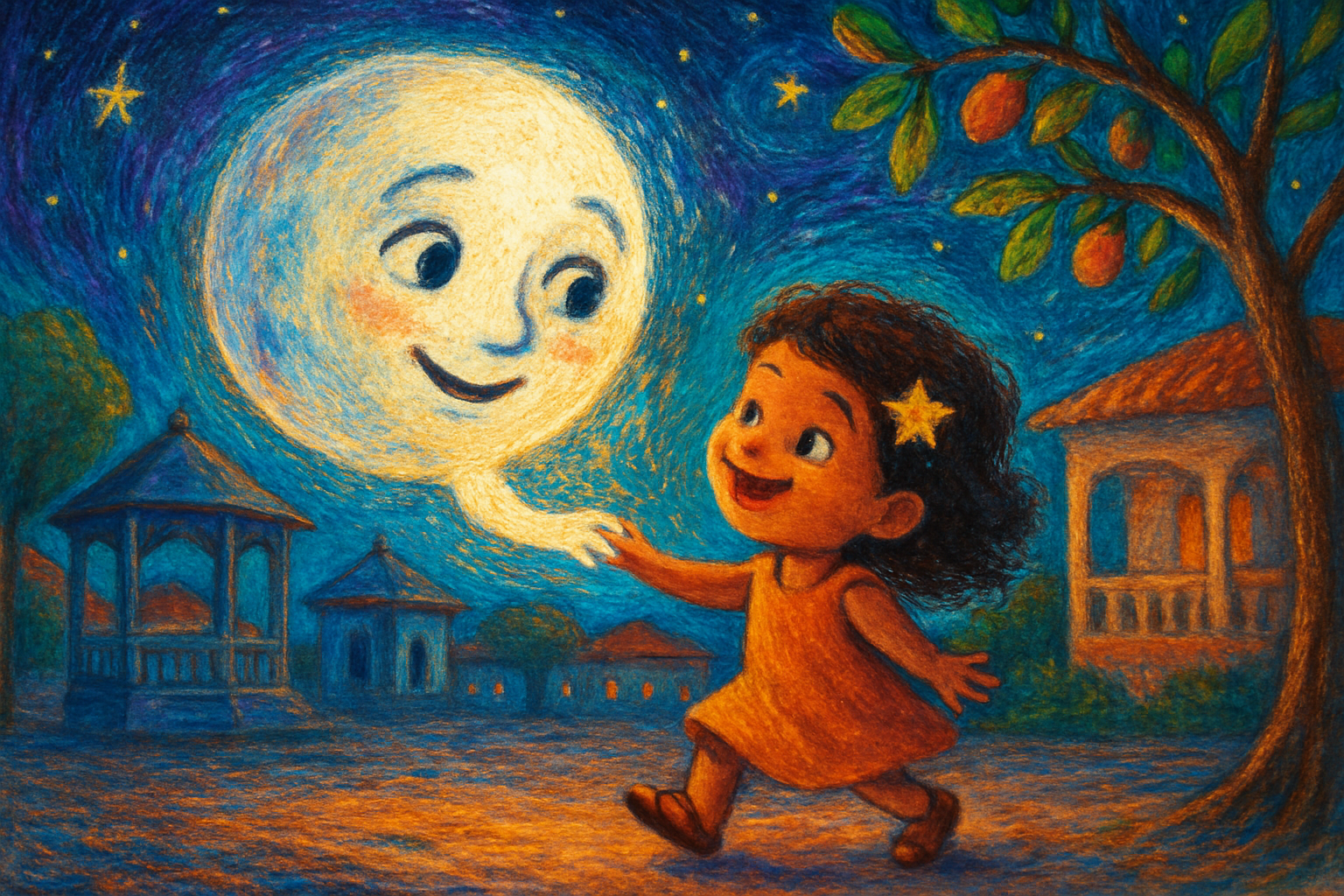 Lá no alto, bem alto, no céu do Brasil, morava uma Lua redonda e brilhante. Ela parecia uma bolacha de leite, grande e clarinha. De dia, ela descansava. À noite, ela acordava e fazia “plim, plim”, acendendo uma luz macia por cima das casas, das árvores e das ruas.