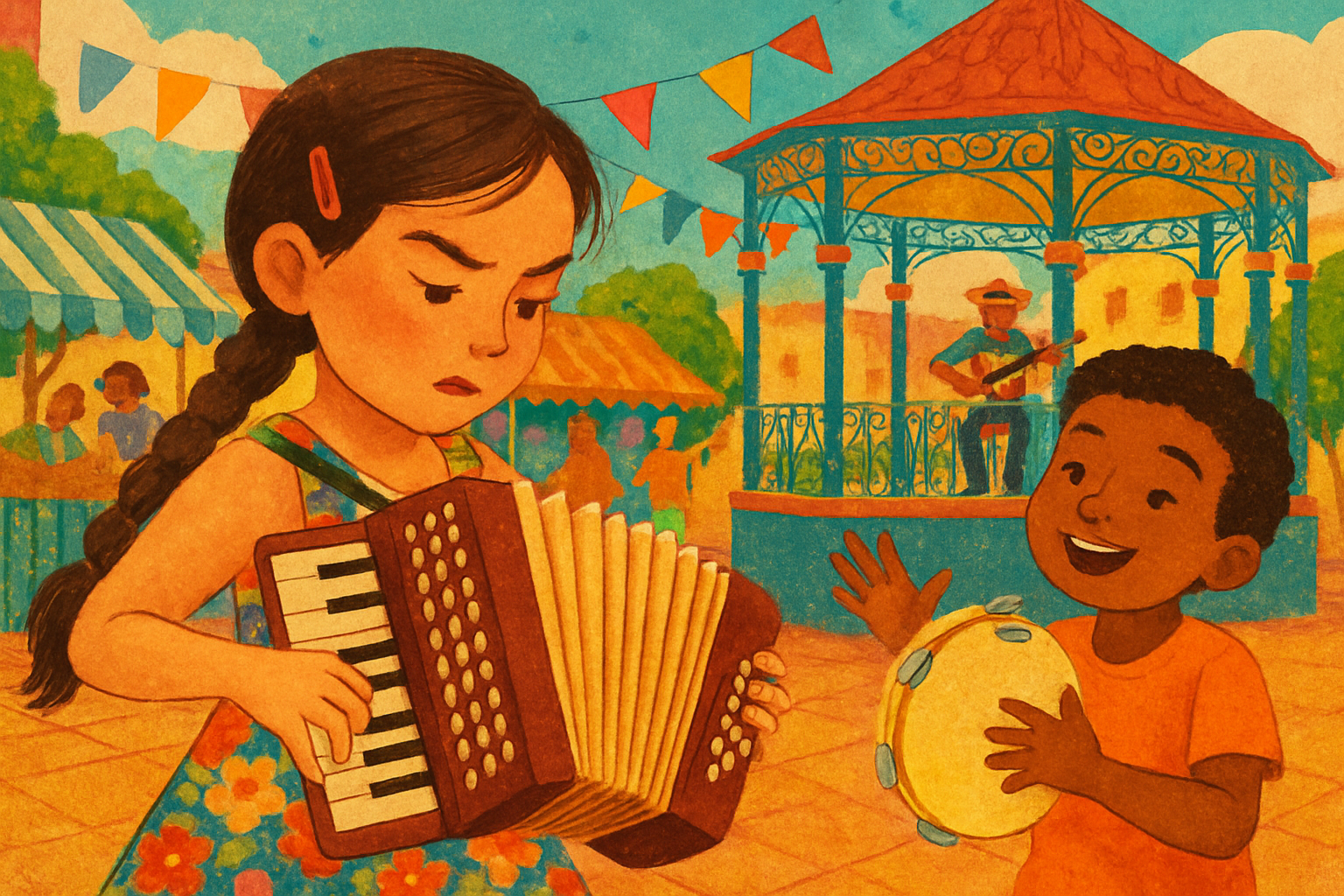 De um lado da praça, sentada no banco perto do coreto, estava **Lia**, uma menina de sete anos com olhos atentos e uma trança comprida balançando nas costas. No colo, ela segurava seu acordeom vermelho, que parecia um pequeno baú mágico com fole de sanfona. Quando Lia apertava as teclas, saíam sons cheios de saudade e alegria, como música de festa de interior.