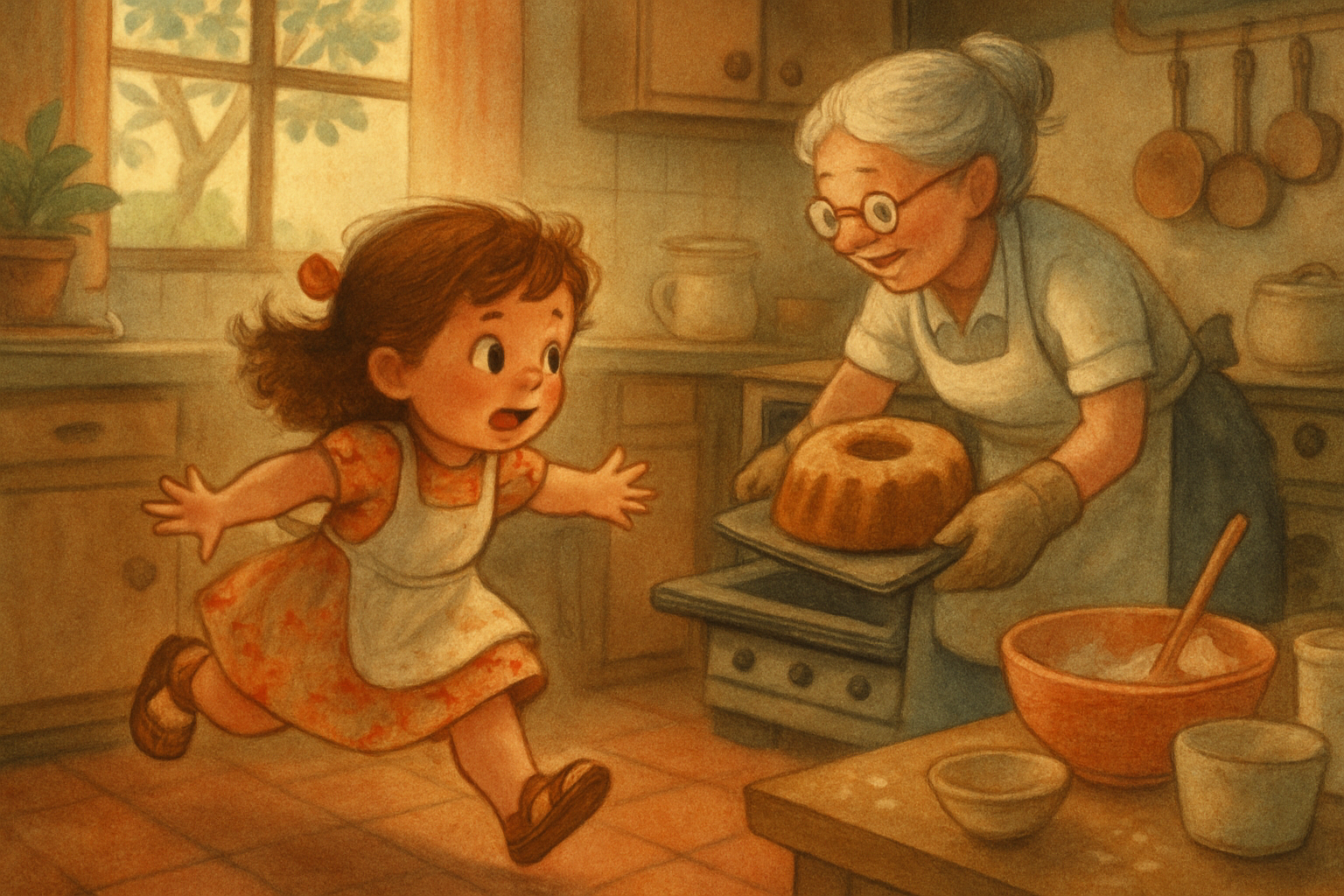 — Tem sim, meu docinho! — respondeu a vovó, com avental florido e cabelo preso num coque fofinho. — Bolo quentinho, pra gente comer com café e leite.