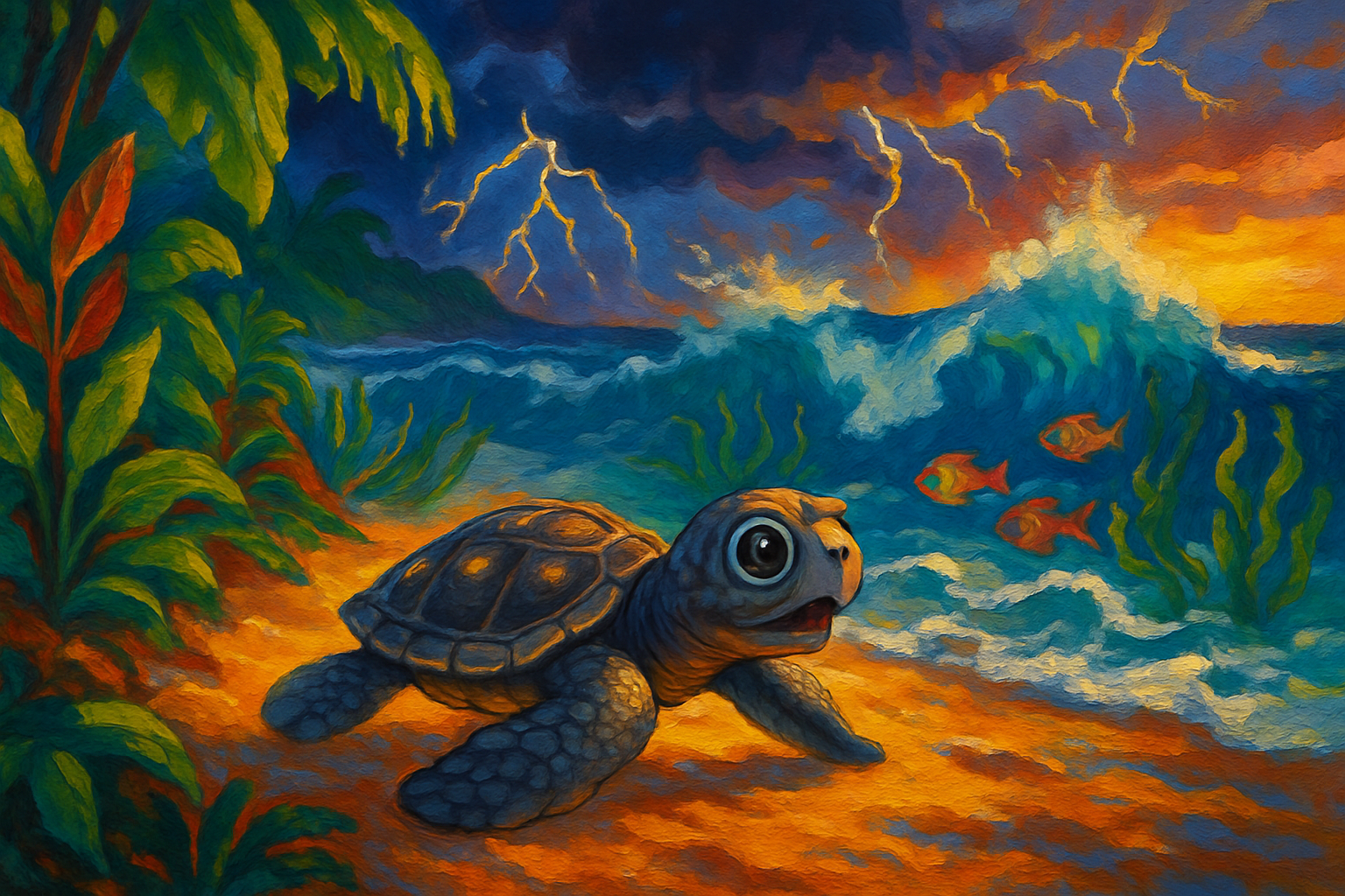 Teca olhou para o céu, onde a lua parecia um grande queijo brilhante. Ela respirou fundo e começou a correr… do jeito de tartaruga filhote: devagar, mas firme.