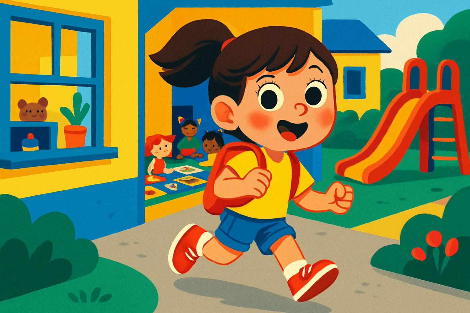 No pátio, tinha cheiro de giz e de brinquedo. Tinha uma escorregadeira vermelha, uma casinha de plástico e um tapete de borracha macio.