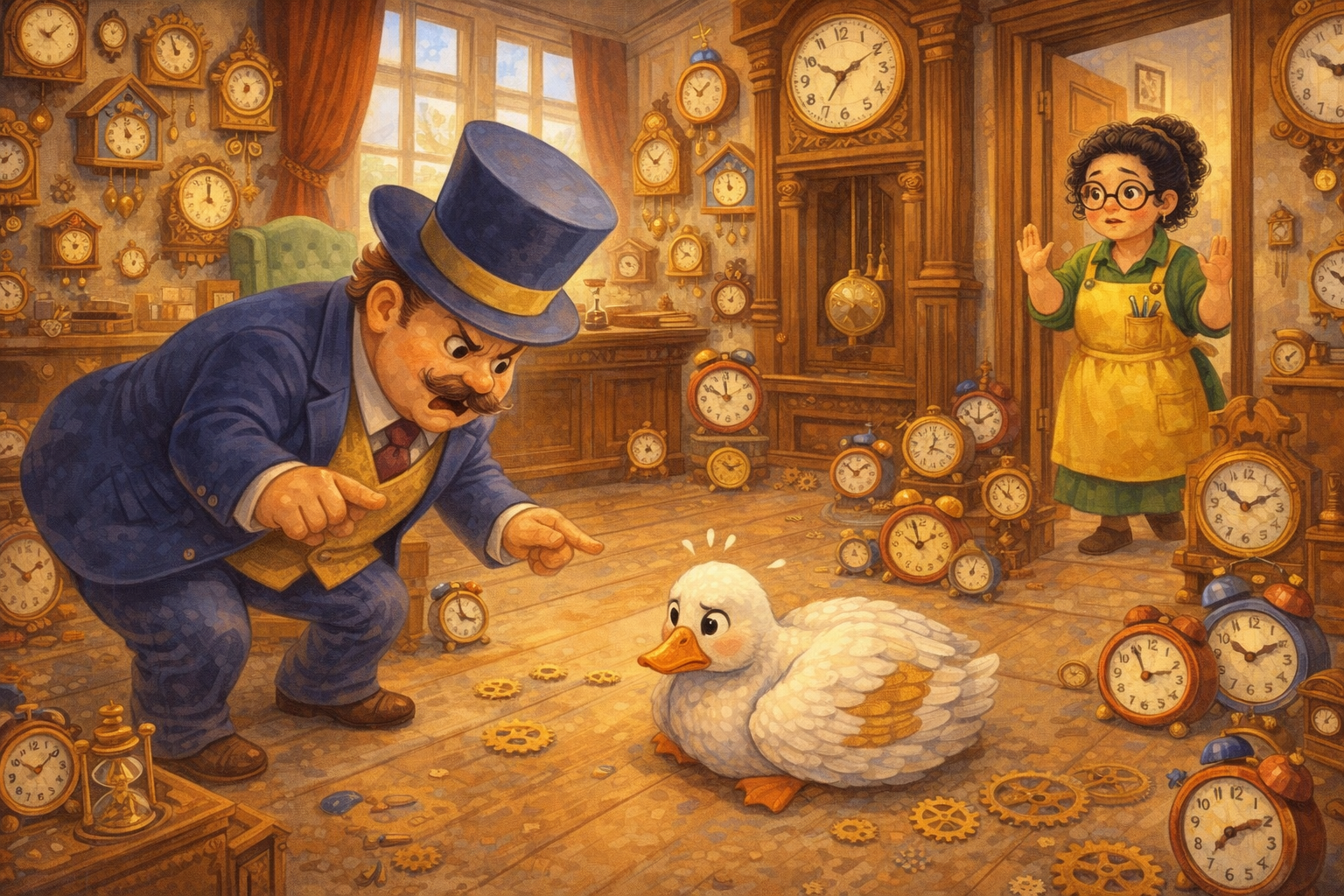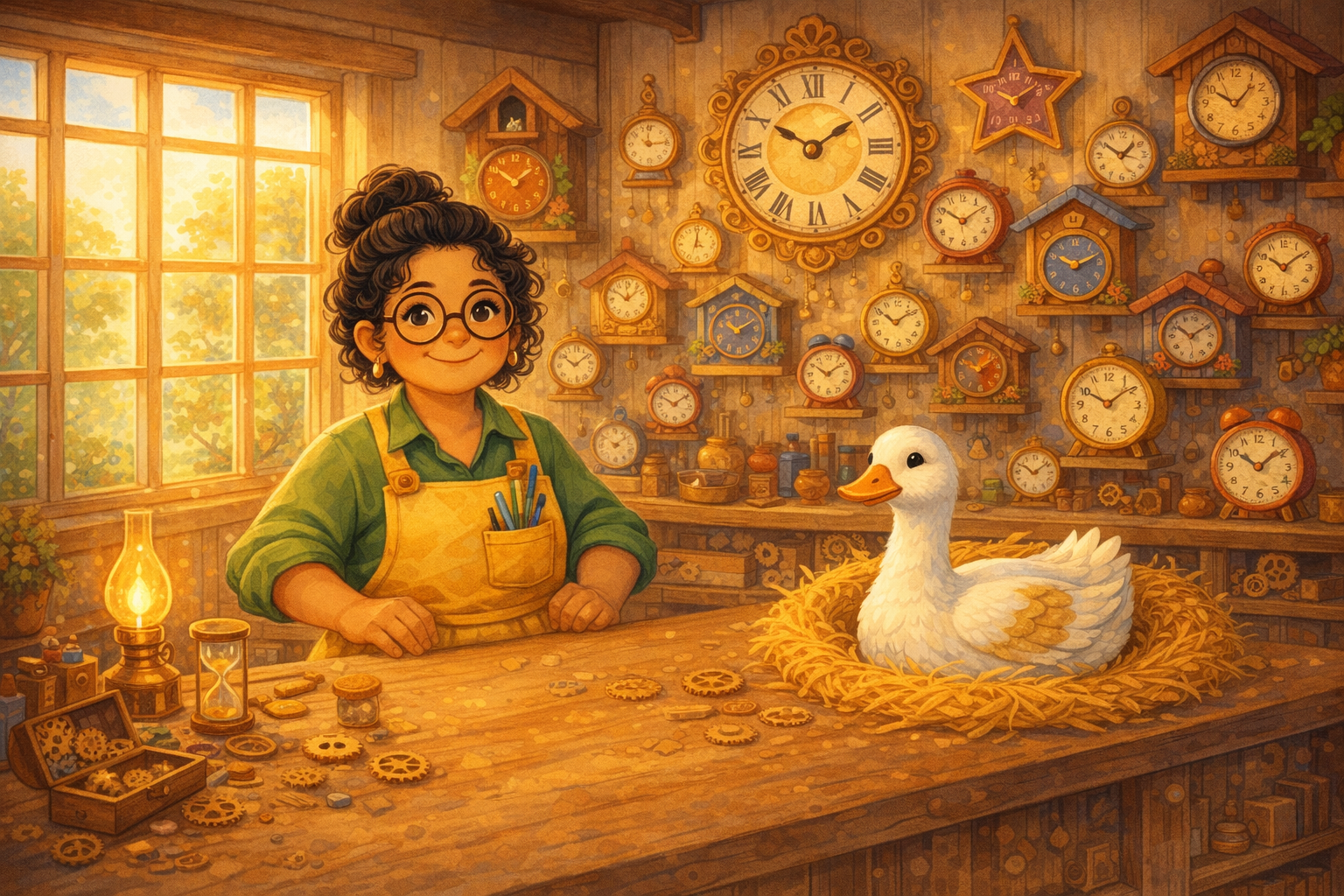 E ela não trabalhava sozinha. Na oficina morava uma gansa branca e fofa. O nome dela era Douradina. Douradina gostava de andar devagar. Bem devagar. E gostava de escutar: — Tic-tac… tic-tac…