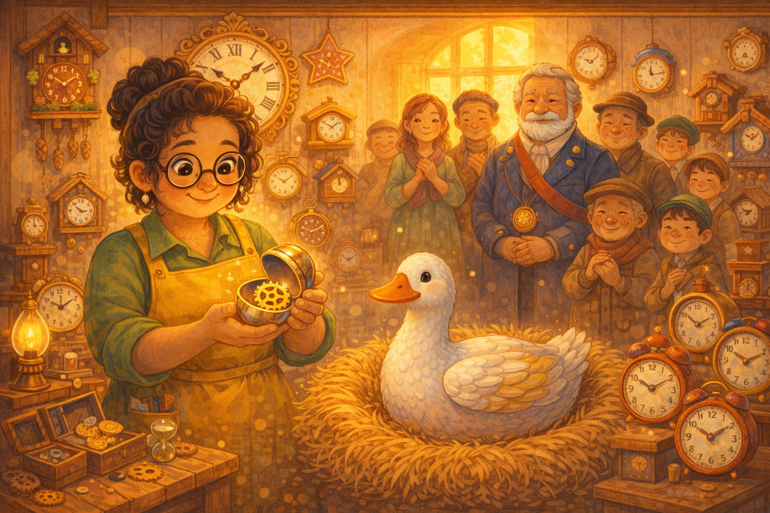 Na manhã seguinte, o sol entrou pela janela. Douradina respirou tranquila. Ela ouviu o som mais gostoso do mundo: — Tic-tac… tic-tac…