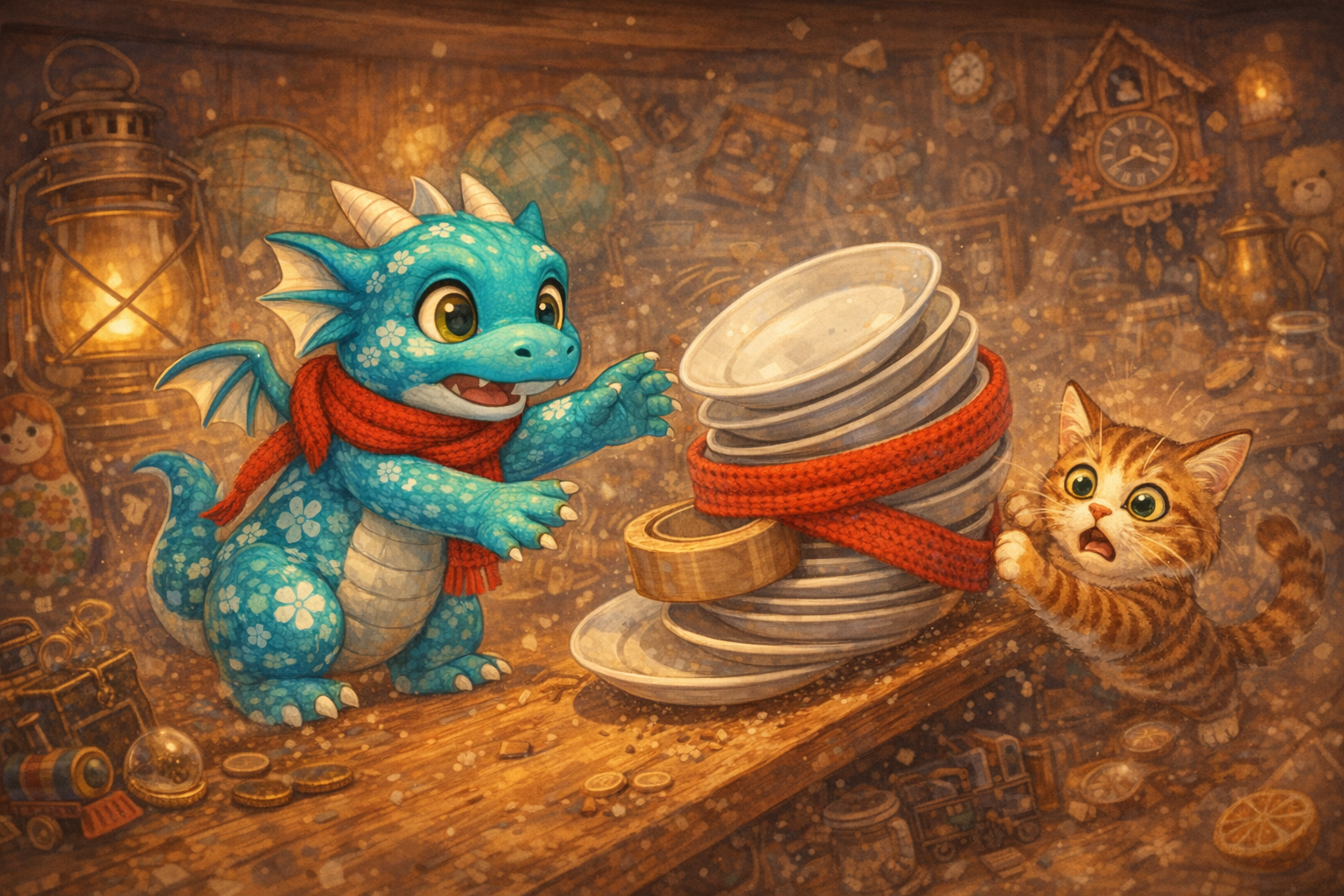 Dona Marlene, que tinha ido atender um cliente por um minuto, voltou e viu a cena: pratos presos pela fita, pote seguro, e Fagulha ofegante (sim, dragões de porcelana também ofegam quando ficam nervosos).