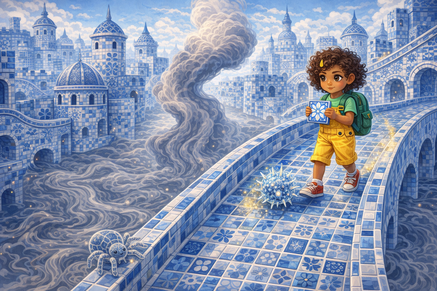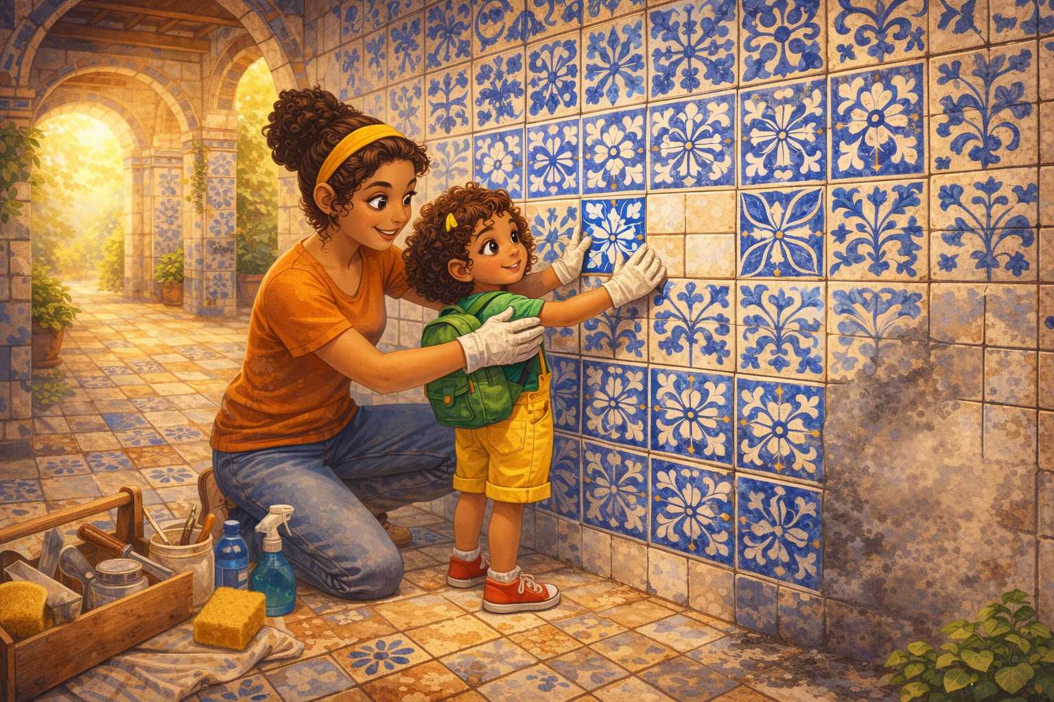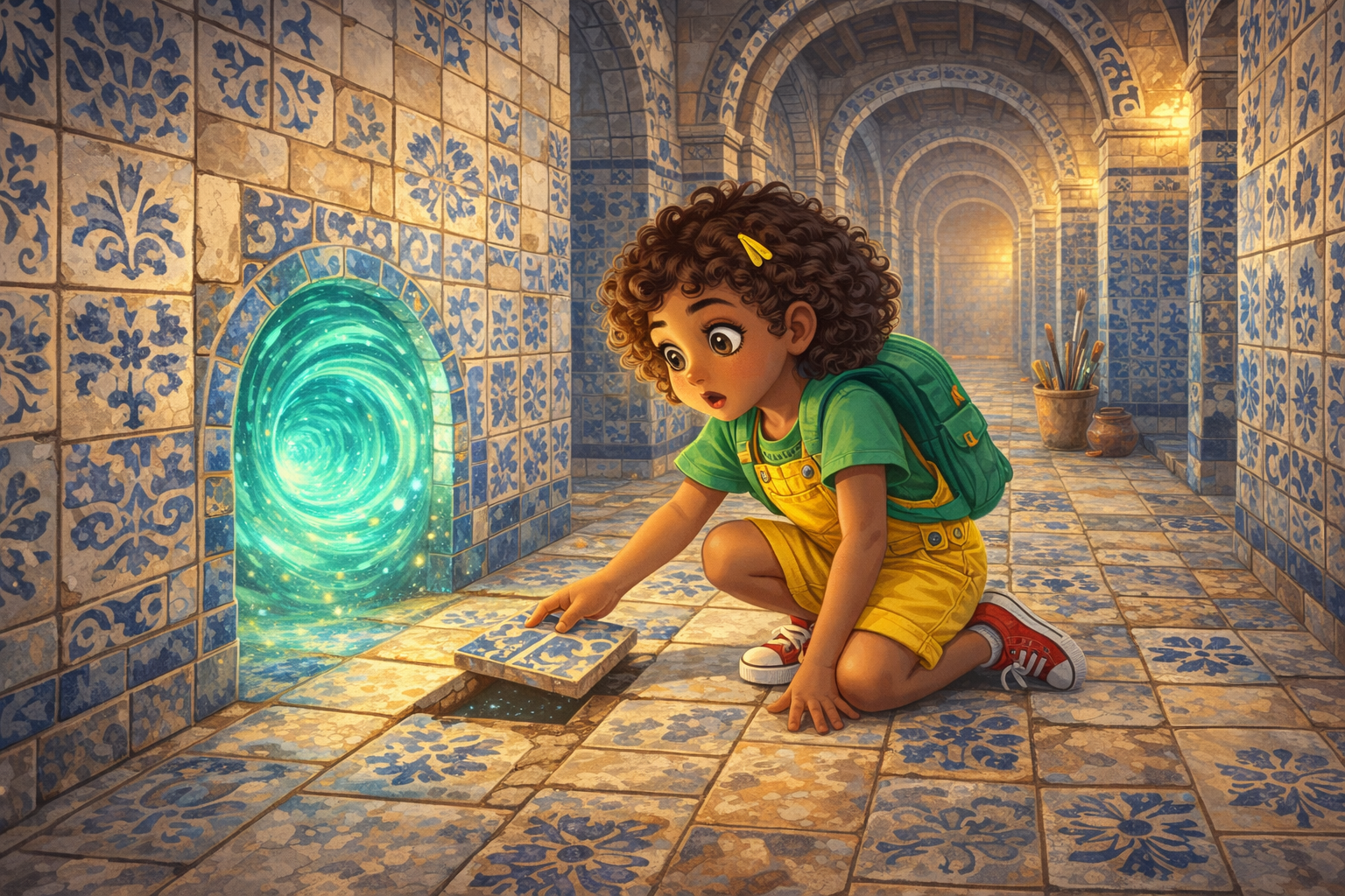 — Bem-vinda ao Reino do Rejunte Brilhante — anunciou o Senhor Mosaico, orgulhoso. — Aqui moram as histórias que os azulejos guardam.