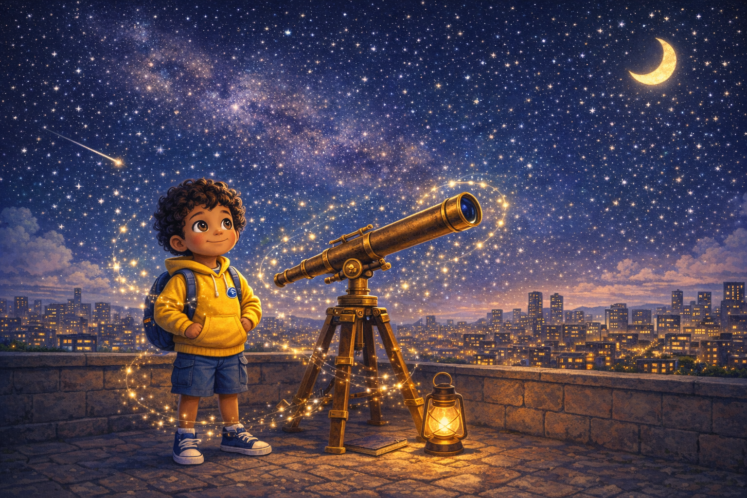 Quando a noite chegou, os três subiram para o terraço do prédio. A cidade brilhava em janelinhas acesas, e o vento era fresquinho, com cheiro de pão vindo da padaria da esquina.