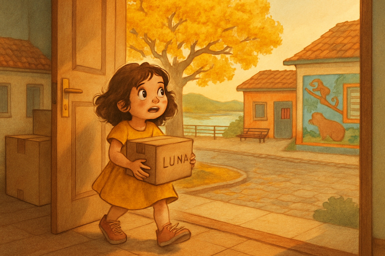O caminhão de mudança chegou numa manhã quentinha, com cheiro de pão na chapa vindo da padaria da esquina. A rua era diferente de tudo o que Luna conhecia: tinha um ipê-amarelo bem na frente da casa nova, e as folhas brilhavam como se tivessem tomado banho de sol.