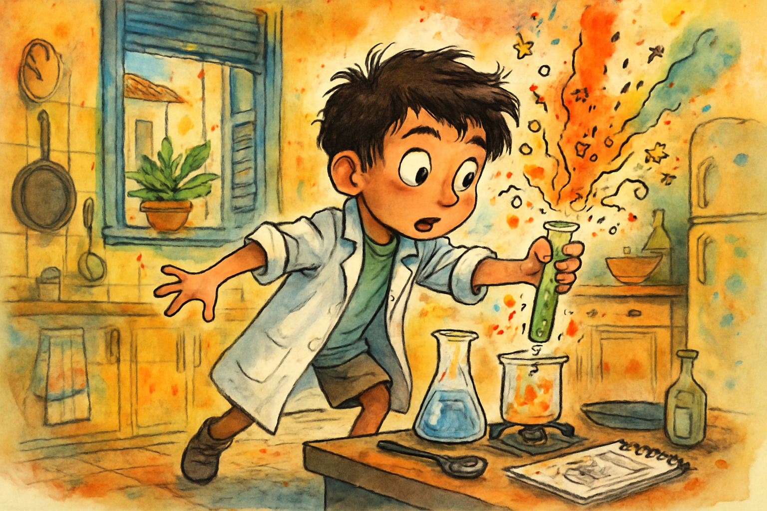 Um menino curioso transforma a cozinha em laboratório e aprende que errar faz parte de descobrir.