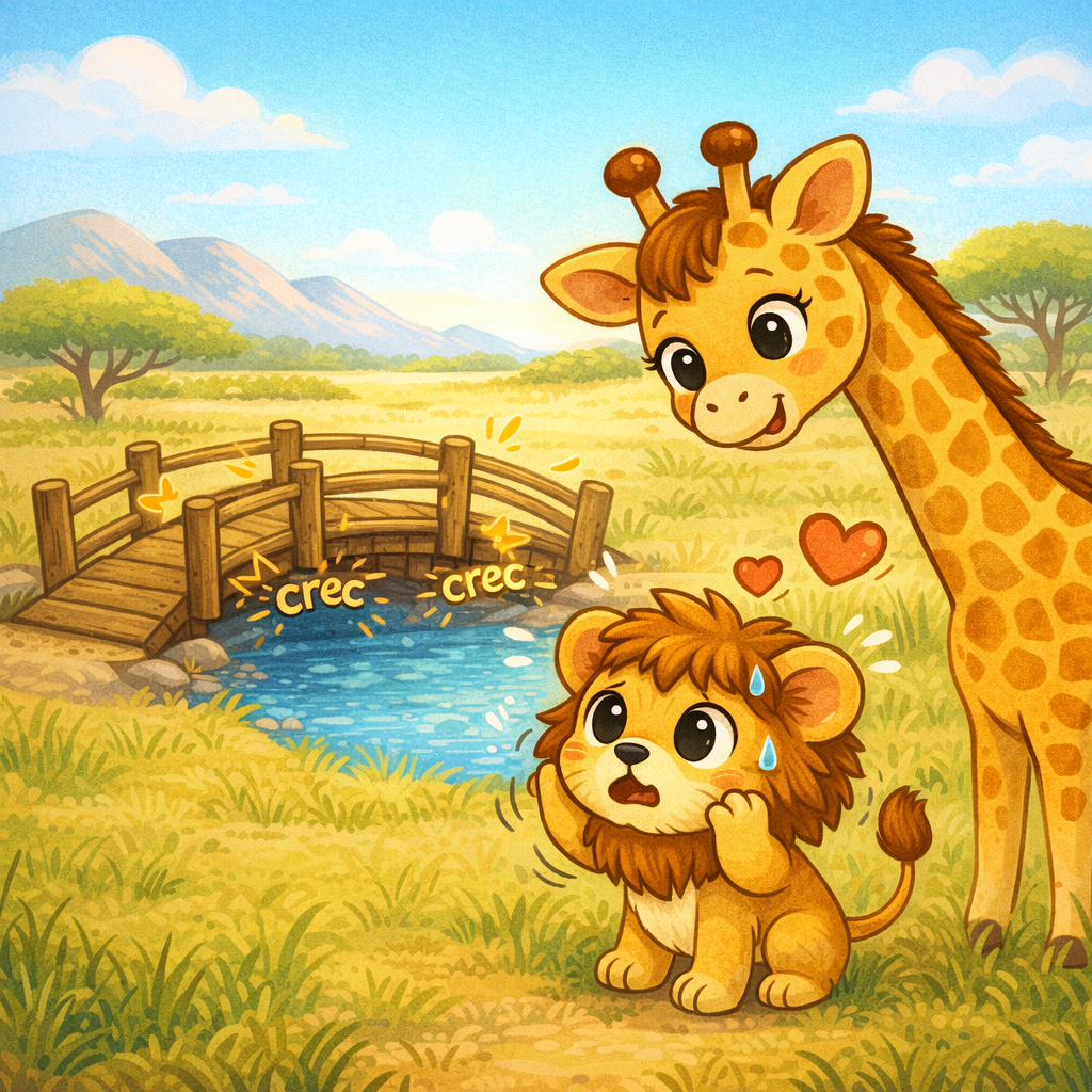 Leo olhou a ponte. Ela fazia “crec… crec…”. O coração dele fez “tum-tum” bem forte. — Eu tô com medo — sussurrou Leo.