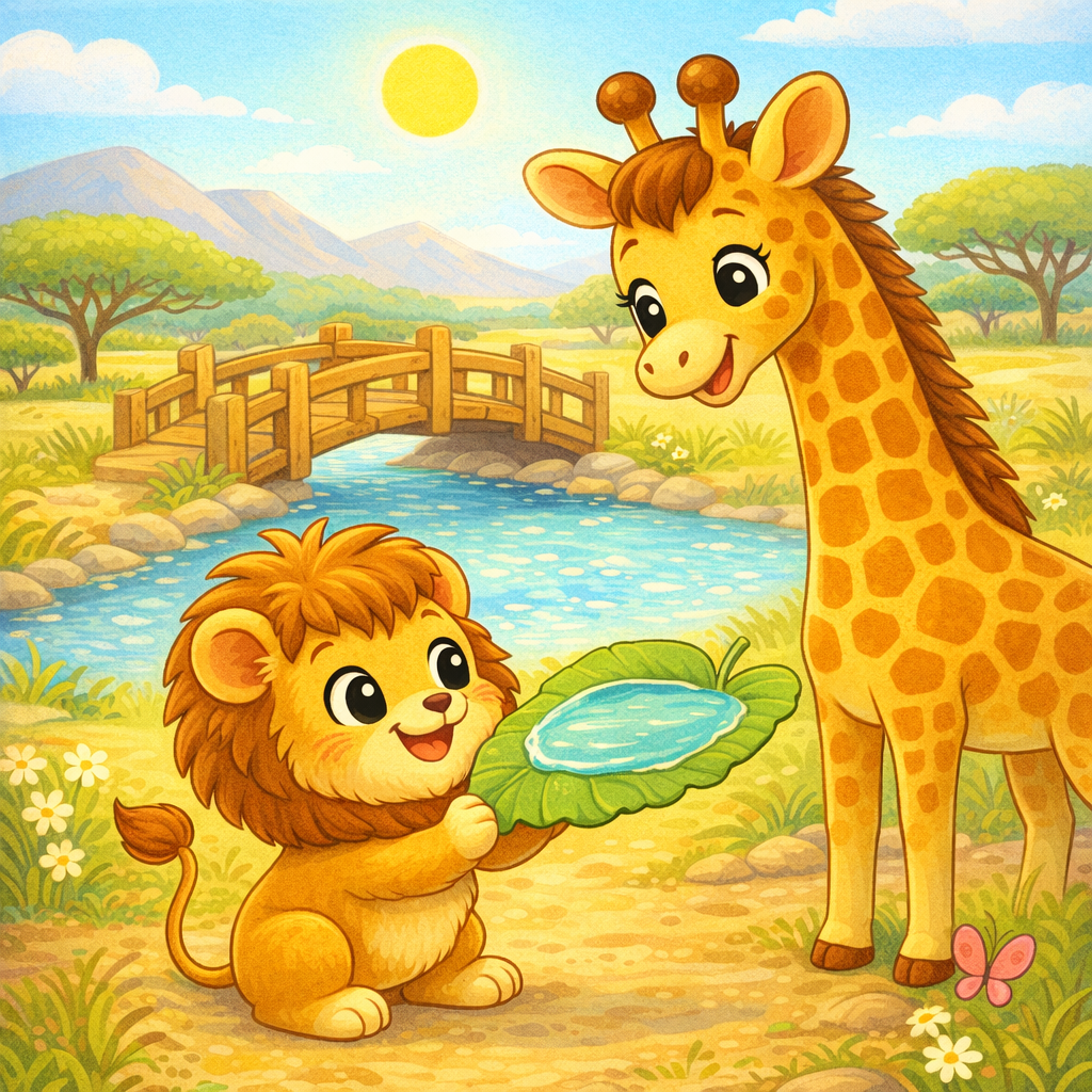 — Eu consegui! — disse Leo, com os olhos brilhando. Ele pegou água fresquinha em uma folhinha grande e voltou devagar.
