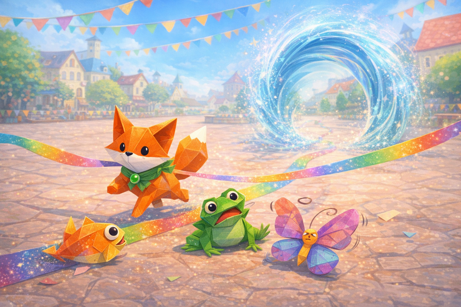 No meio da praça, tinha um arco de vento. Era como um portal feito de brisa.