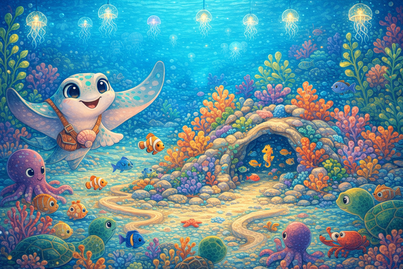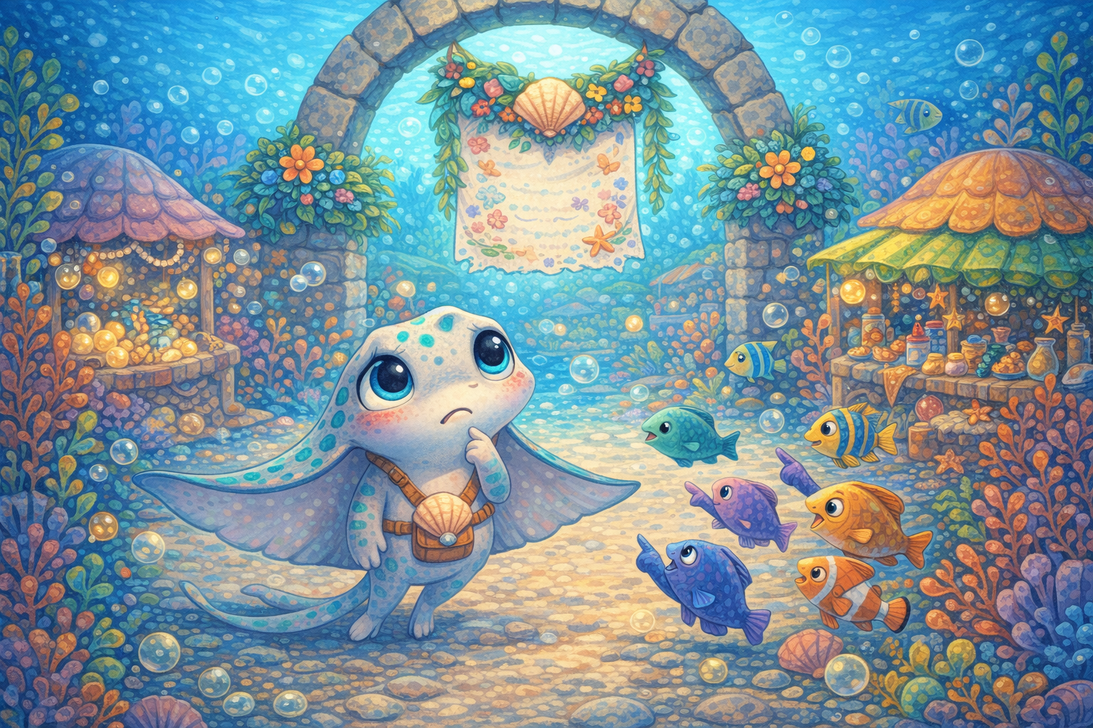 Tajá era uma arraia ainda jovem, de corpo cinza-claro salpicado por pintas turquesa, e carregava sempre uma bolsinha de conchas atravessada no peito. Dentro dela, guardava pedacinhos de coral caídos, sementes de algas e pequenas pedras lisas que, segundo ela, tinham “bons pensamentos”.