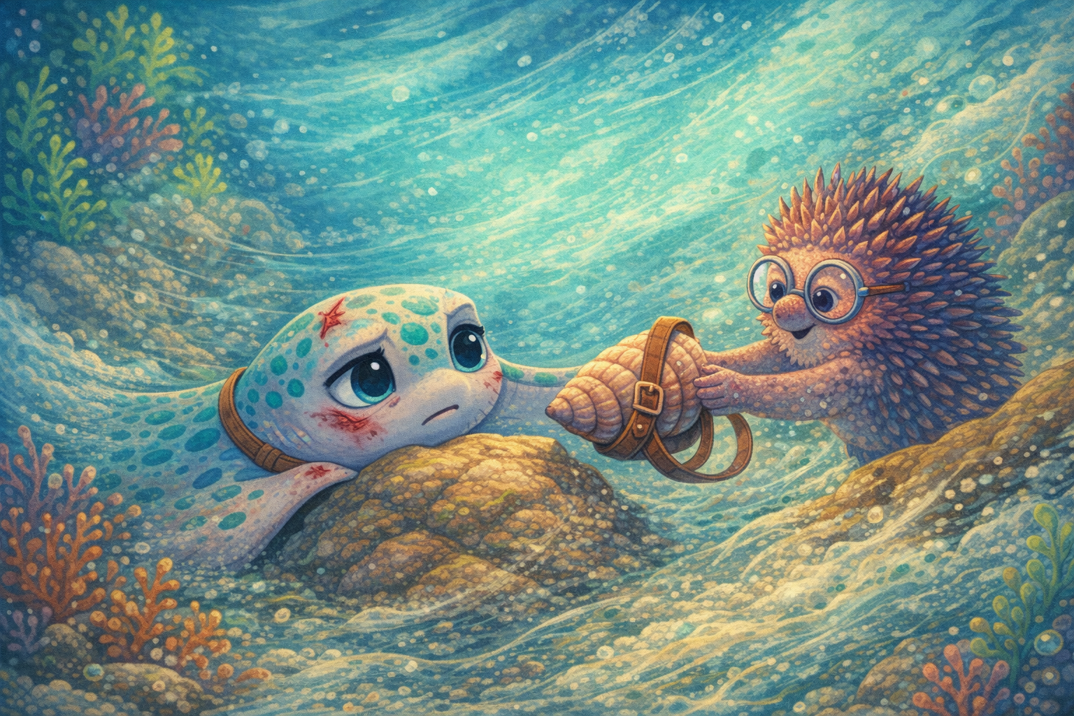 Nos dias seguintes, Dona Berenice ajudou Tajá a cuidar do corte e, mais importante, a planejar. Em vez de correr, Tajá aprendeu a usar a corrente a seu favor: a virar o corpo no ângulo certo, a cavar sulcos suaves na areia para guiar bolinhas de comida até cantinhos protegidos, a escolher corais já soltos (sem arrancar nada vivo) e replantá-los em pequenas “cercas”.