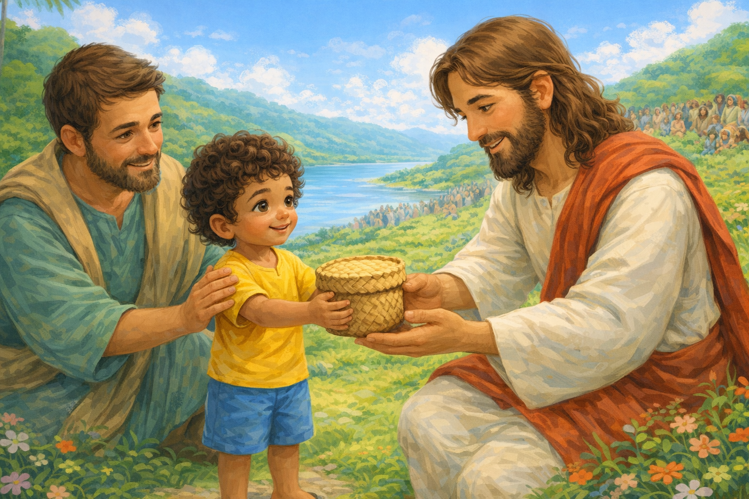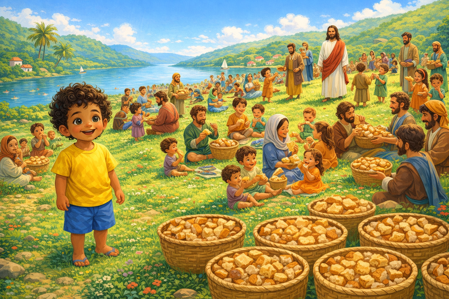 A Bíblia conta que, um dia, havia um menino com um lanchinho perto de Jesus. A gente não sabe o nome dele. Mas, nesta história, vamos chamar esse menino de Tito.