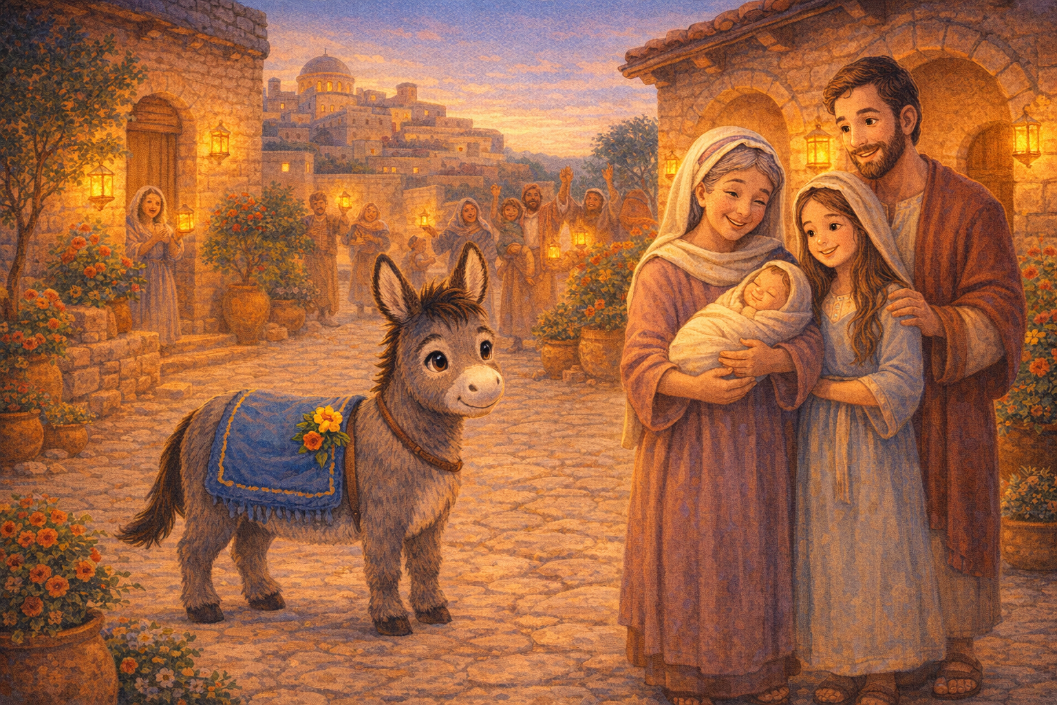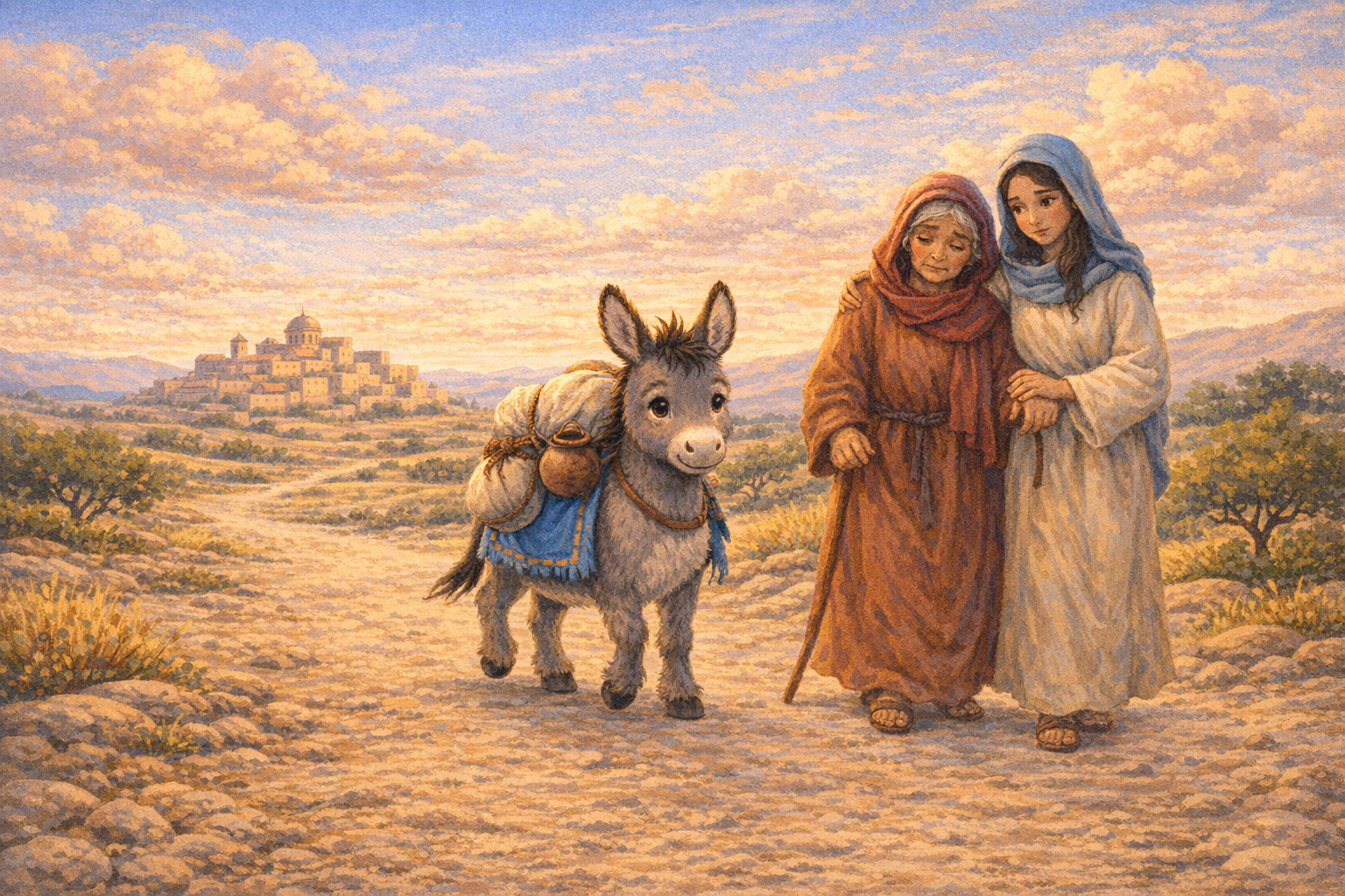 Zazá era um jumentinho pequeno, de pelo cinza e olhos atentos. Ele tinha uma manta azul bem gasta nas costas, presa com um laço simples. Zazá morava em Moabe, uma terra de colinas e caminhos de poeira, onde as pessoas plantavam, colhiam e faziam pão em fornos de barro.