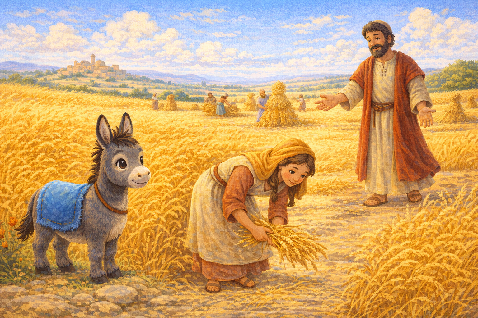 Mas Noemi e Rute eram pobres e tinham pouca comida. Naquele tempo, Deus tinha ensinado ao povo de Israel uma coisa muito bonita: os donos dos campos não deviam pegar tudo para si. Eles deixavam cair algumas espigas, e os mais pobres e os estrangeiros podiam recolher o que sobrasse. Era um jeito de cuidar de quem precisava.
